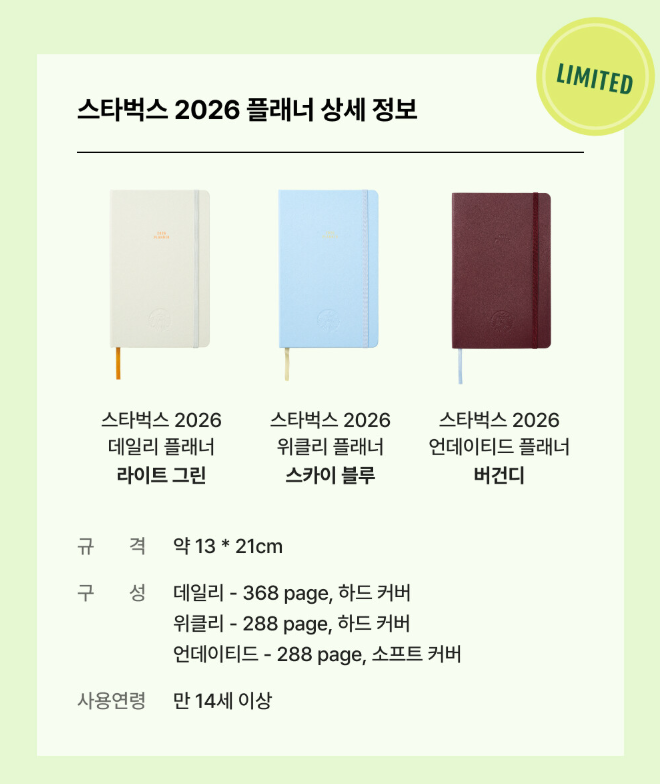 - 플래너 3종 (라이트 그린 / 스카이 블루 / 버건디)